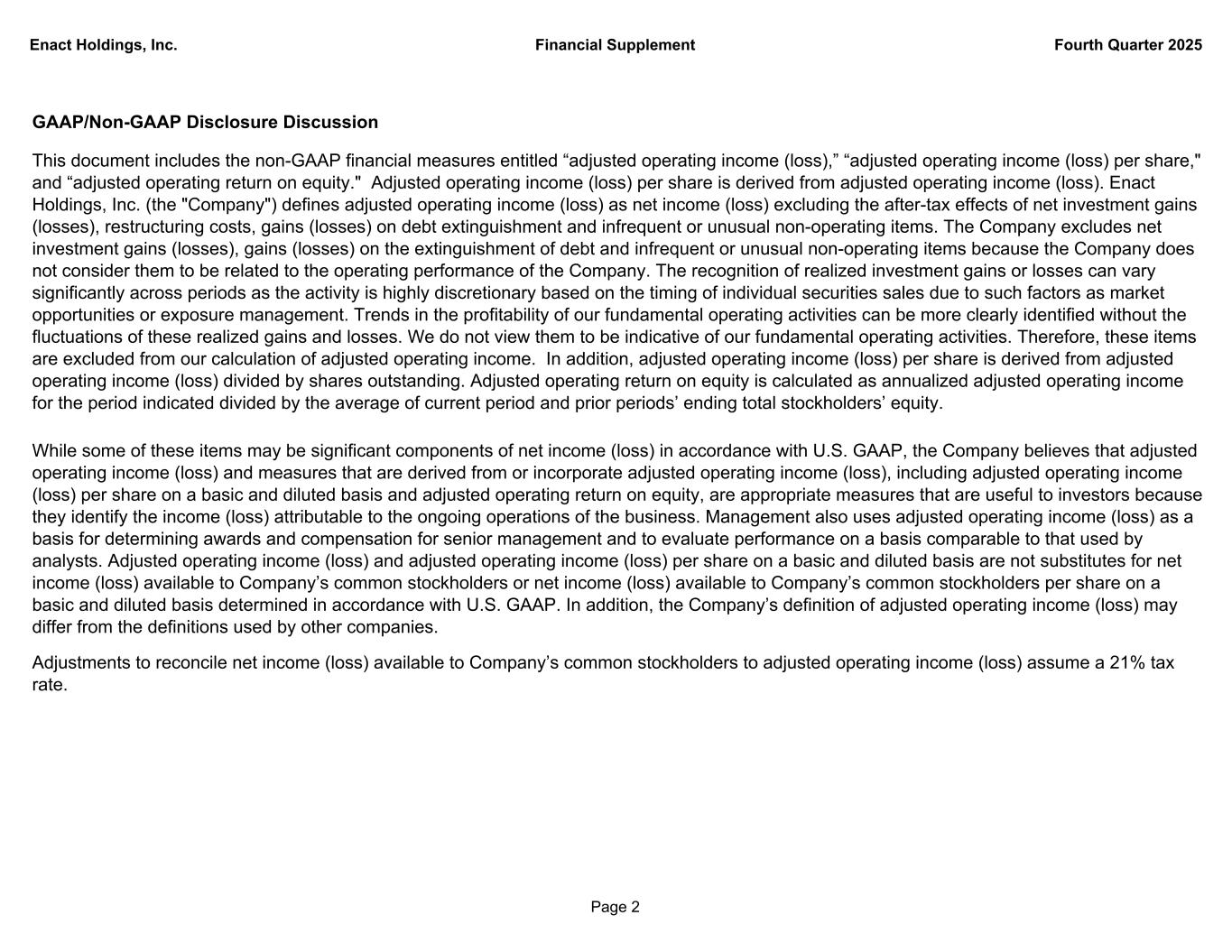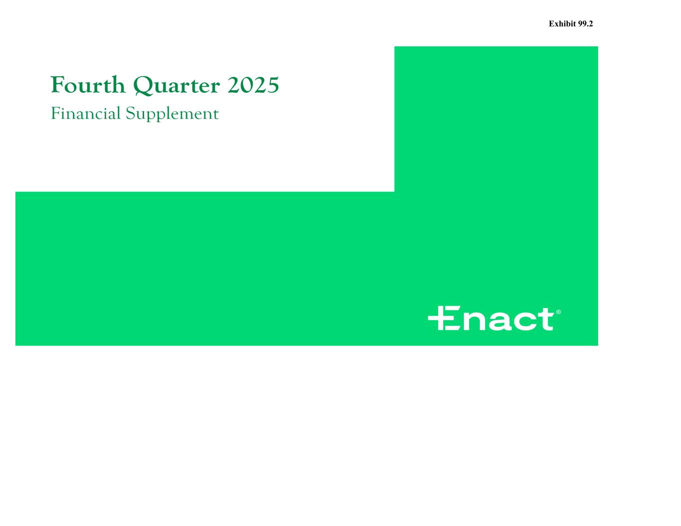 Enact Holdings, Inc. Financial Supplement Fourth Quarter 2025 GAAP/Non-GAAP Disclosure Discussion This document includes the non-GAAP financial measures entitled “adjusted operating income (loss),” “adjusted operating income (loss) per share," and “adjusted operating return on equity." Adjusted operating income (loss) per share is derived from adjusted operating income (loss). Enact Holdings, Inc. (the "Company") defines adjusted operating income (loss) as net income (loss) excluding the after-tax effects of net investment gains (losses), restructuring costs, gains (losses) on debt extinguishment and infrequent or unusual non-operating items. The Company excludes net investment gains (losses), gains (losses) on the extinguishment of debt and infrequent or unusual non-operating items because the Company does not consider them to be related to the operating performance of the Company. The recognition of realized investment gains or losses can vary significantly across periods as the activity is highly discretionary based on the timing of individual securities sales due to such factors as market opportunities or exposure management. Trends in the profitability of our fundamental operating activities can be more clearly identified without the fluctuations of these realized gains and losses. We do not view them to be indicative of our fundamental operating activities. Therefore, these items are excluded from our calculation of adjusted operating income. In addition, adjusted operating income (loss) per share is derived from adjusted operating income (loss) divided by shares outstanding. Adjusted operating return on equity is calculated as annualized adjusted operating income for the period indicated divided by the average of current period and prior periods’ ending total stockholders’ equity. While some of these items may be significant components of net income (loss) in accordance with U.S. GAAP, the Company believes that adjusted operating income (loss) and measures that are derived from or incorporate adjusted operating income (loss), including adjusted operating income (loss) per share on a basic and diluted basis and adjusted operating return on equity, are appropriate measures that are useful to investors because they identify the income (loss) attributable to the ongoing operations of the business. Management also uses adjusted operating income (loss) as a basis for determining awards and compensation for senior management and to evaluate performance on a basis comparable to that used by analysts. Adjusted operating income (loss) and adjusted operating income (loss) per share on a basic and diluted basis are not substitutes for net income (loss) available to Company’s common stockholders or net income (loss) available to Company’s common stockholders per share on a basic and diluted basis determined in accordance with U.S. GAAP. In addition, the Company’s definition of adjusted operating income (loss) may differ from the definitions used by other companies. Adjustments to reconcile net income (loss) available to Company’s common stockholders to adjusted operating income (loss) assume a 21% tax rate. Page 2