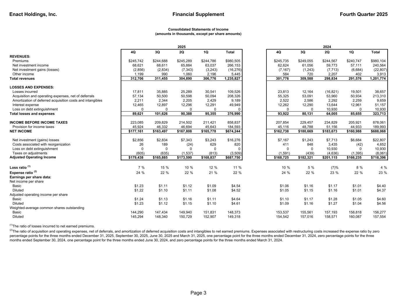 Enact Holdings, Inc. Financial Supplement Fourth Quarter 2025 4Q 3Q 2Q 1Q Total 4Q 3Q 2Q 1Q Total REVENUES: Premiums $245,742 $244,688 $245,289 $244,786 $980,505 $245,735 $249,055 $244,567 $240,747 $980,104 Net investment income 68,621 68,611 65,884 63,037 266,153 62,624 61,056 59,773 57,111 240,564 Net investment gains (losses) (2,856) (2,834) (7,343) (3,243) (16,276) (7,167) (1,243) (7,713) (6,684) (22,807) Other income 1,199 990 1,060 2,196 5,445 584 720 2,207 402 3,913 Total revenues 312,706 311,455 304,890 306,776 1,235,827 301,776 309,588 298,834 291,576 1,201,774 LOSSES AND EXPENSES: Losses incurred 17,811 35,885 25,289 30,541 109,526 23,813 12,164 (16,821) 19,501 38,657 Acquisition and operating expenses, net of deferrals 57,134 50,500 50,598 50,094 208,326 55,325 53,091 53,960 50,934 213,310 Amortization of deferred acquisition costs and intangibles 2,211 2,344 2,205 2,429 9,189 2,522 2,586 2,292 2,259 9,659 Interest expense 12,465 12,897 12,296 12,291 49,949 12,262 12,290 13,644 12,961 51,157 Loss on debt extinguishment 0 0 0 0 0 0 0 10,930 0 10,930 Total losses and expenses 89,621 101,626 90,388 95,355 376,990 93,922 80,131 64,005 85,655 323,713 INCOME BEFORE INCOME TAXES 223,085 209,829 214,502 211,421 858,837 207,854 229,457 234,829 205,921 878,061 Provision for income taxes 45,924 46,332 46,694 45,643 184,593 45,116 48,788 51,156 44,933 189,993 NET INCOME $177,161 $163,497 $167,808 $165,778 $674,244 $162,738 $180,669 $183,673 $160,988 $688,068 Net investment (gains) losses $2,856 $2,834 $7,343 $3,243 $16,276 $7,167 $1,243 $7,713 $6,684 $22,807 Costs associated with reorganization 26 189 (24) 629 820 411 848 3,435 (42) 4,652 Loss on debt extinguishment 0 0 0 0 0 0 0 10,930 0 10,930 Taxes on adjustments (605) (635) (1,537) (813) (3,509) (1,591) (439) (4,636) (1,395) (8,061) Adjusted Operating Income $179,438 $165,885 $173,590 $168,837 $687,750 $168,725 $182,321 $201,115 $166,235 $718,396 Loss ratio (1) 7 % 15 % 10 % 12 % 11 % 10 % 5 % (7)% 8 % 4 % Expense ratio (2) 24 % 22 % 22 % 21 % 22 % 24 % 22 % 23 % 22 % 23 % Earnings per share data: Net income per share Basic $1.23 $1.11 $1.12 $1.09 $4.54 $1.06 $1.16 $1.17 $1.01 $4.40 Diluted $1.22 $1.10 $1.11 $1.08 $4.52 $1.05 $1.15 $1.16 $1.01 $4.37 Adjusted operating income per share Basic $1.24 $1.13 $1.16 $1.11 $4.64 $1.10 $1.17 $1.28 $1.05 $4.60 Diluted $1.23 $1.12 $1.15 $1.10 $4.61 $1.09 $1.16 $1.27 $1.04 $4.56 Weighted-average common shares outstanding Basic 144,290 147,434 149,940 151,831 148,373 153,537 155,561 157,193 158,818 156,277 Diluted 145,294 148,340 150,729 152,907 149,318 154,542 157,016 158,571 160,087 157,554 (2)The ratio of acquisition and operating expenses, net of deferrals, and amortization of deferred acquisition costs and intangibles to net earned premiums. Expenses associated with restructuring costs increased the expense ratio by zero percentage points for the three months ended December 31, 2025, September 30, 2025, June 30, 2025 and March 31, 2025, one percentage point for the three months ended December 31, 2024, zero percentage points for the three months ended September 30, 2024, one percentage point for the three months ended June 30, 2024, and zero percentage points for the three months ended March 31, 2024. 2024 (1)The ratio of losses incurred to net earned premiums. Consolidated Statements of Income (amounts in thousands, except per share amounts) 2025 Page 3