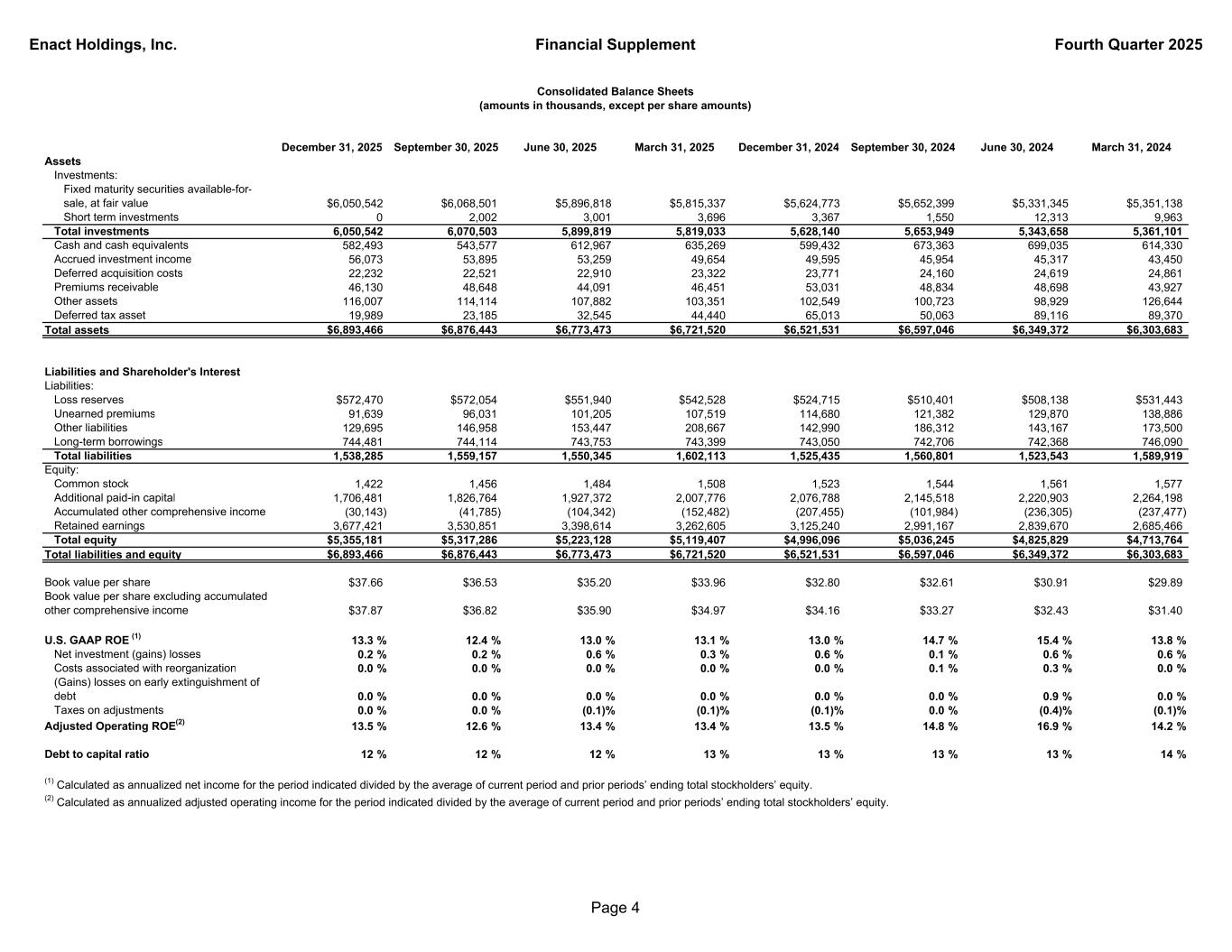 Enact Holdings, Inc. Financial Supplement Fourth Quarter 2025 December 31, 2025 September 30, 2025 June 30, 2025 March 31, 2025 December 31, 2024 September 30, 2024 June 30, 2024 March 31, 2024 Assets Investments: Fixed maturity securities available-for- sale, at fair value $6,050,542 $6,068,501 $5,896,818 $5,815,337 $5,624,773 $5,652,399 $5,331,345 $5,351,138 Short term investments 0 2,002 3,001 3,696 3,367 1,550 12,313 9,963 Total investments 6,050,542 6,070,503 5,899,819 5,819,033 5,628,140 5,653,949 5,343,658 5,361,101 Cash and cash equivalents 582,493 543,577 612,967 635,269 599,432 673,363 699,035 614,330 Accrued investment income 56,073 53,895 53,259 49,654 49,595 45,954 45,317 43,450 Deferred acquisition costs 22,232 22,521 22,910 23,322 23,771 24,160 24,619 24,861 Premiums receivable 46,130 48,648 44,091 46,451 53,031 48,834 48,698 43,927 Other assets 116,007 114,114 107,882 103,351 102,549 100,723 98,929 126,644 Deferred tax asset 19,989 23,185 32,545 44,440 65,013 50,063 89,116 89,370 Total assets $6,893,466 $6,876,443 $6,773,473 $6,721,520 $6,521,531 $6,597,046 $6,349,372 $6,303,683 Liabilities and Shareholder's Interest Liabilities: Loss reserves $572,470 $572,054 $551,940 $542,528 $524,715 $510,401 $508,138 $531,443 Unearned premiums 91,639 96,031 101,205 107,519 114,680 121,382 129,870 138,886 Other liabilities 129,695 146,958 153,447 208,667 142,990 186,312 143,167 173,500 Long-term borrowings 744,481 744,114 743,753 743,399 743,050 742,706 742,368 746,090 Total liabilities 1,538,285 1,559,157 1,550,345 1,602,113 1,525,435 1,560,801 1,523,543 1,589,919 Equity: Common stock 1,422 1,456 1,484 1,508 1,523 1,544 1,561 1,577 Additional paid-in capital 1,706,481 1,826,764 1,927,372 2,007,776 2,076,788 2,145,518 2,220,903 2,264,198 Accumulated other comprehensive income (30,143) (41,785) (104,342) (152,482) (207,455) (101,984) (236,305) (237,477) Retained earnings 3,677,421 3,530,851 3,398,614 3,262,605 3,125,240 2,991,167 2,839,670 2,685,466 Total equity $5,355,181 $5,317,286 $5,223,128 $5,119,407 $4,996,096 $5,036,245 $4,825,829 $4,713,764 Total liabilities and equity $6,893,466 $6,876,443 $6,773,473 $6,721,520 $6,521,531 $6,597,046 $6,349,372 $6,303,683 Book value per share $37.66 $36.53 $35.20 $33.96 $32.80 $32.61 $30.91 $29.89 Book value per share excluding accumulated other comprehensive income $37.87 $36.82 $35.90 $34.97 $34.16 $33.27 $32.43 $31.40 U.S. GAAP ROE (1) 13.3 % 12.4 % 13.0 % 13.1 % 13.0 % 14.7 % 15.4 % 13.8 % Net investment (gains) losses 0.2 % 0.2 % 0.6 % 0.3 % 0.6 % 0.1 % 0.6 % 0.6 % Costs associated with reorganization 0.0 % 0.0 % 0.0 % 0.0 % 0.0 % 0.1 % 0.3 % 0.0 % (Gains) losses on early extinguishment of debt 0.0 % 0.0 % 0.0 % 0.0 % 0.0 % 0.0 % 0.9 % 0.0 % Taxes on adjustments 0.0 % 0.0 % (0.1)% (0.1)% (0.1)% 0.0 % (0.4)% (0.1)% Adjusted Operating ROE(2) 13.5 % 12.6 % 13.4 % 13.4 % 13.5 % 14.8 % 16.9 % 14.2 % Debt to capital ratio 12 % 12 % 12 % 13 % 13 % 13 % 13 % 14 % (2) Calculated as annualized adjusted operating income for the period indicated divided by the average of current period and prior periods’ ending total stockholders’ equity. (1) Calculated as annualized net income for the period indicated divided by the average of current period and prior periods’ ending total stockholders’ equity. Consolidated Balance Sheets (amounts in thousands, except per share amounts) Page 4