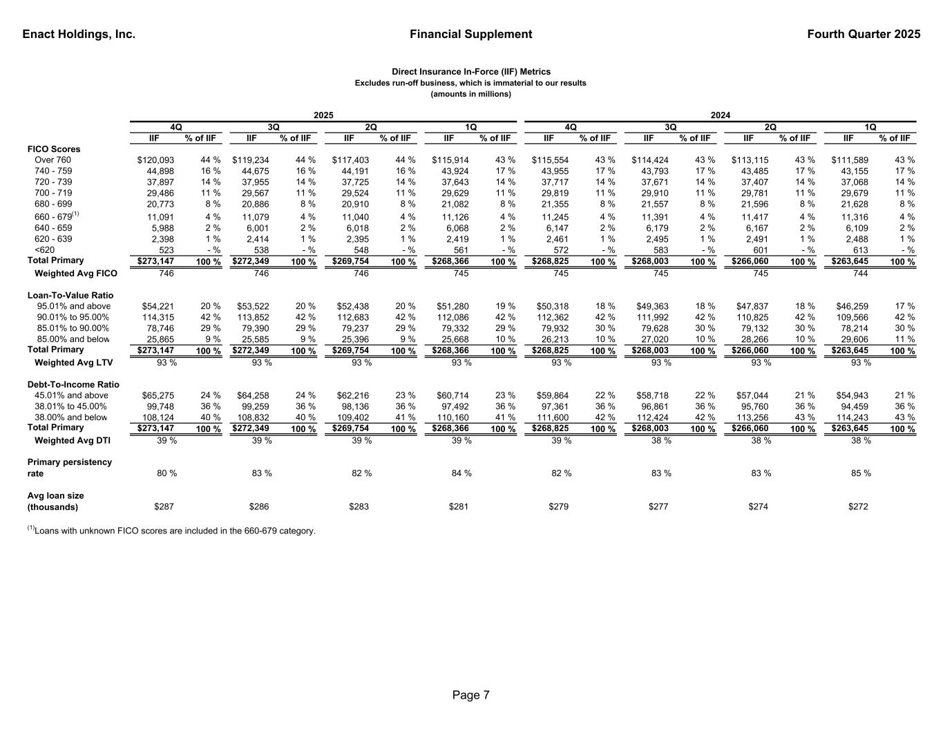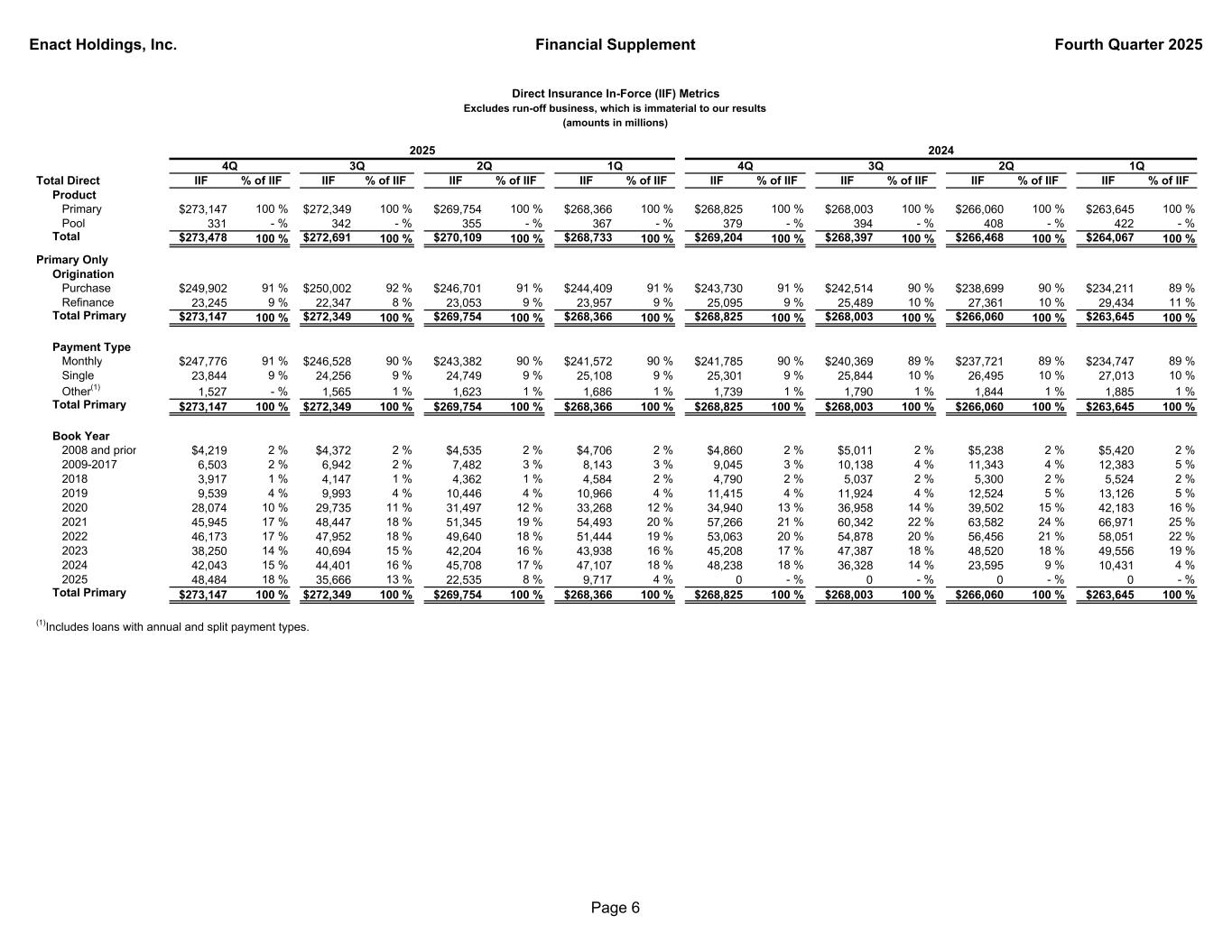 Enact Holdings, Inc. Financial Supplement Fourth Quarter 2025 Total Direct IIF % of IIF IIF % of IIF IIF % of IIF IIF % of IIF IIF % of IIF IIF % of IIF IIF % of IIF IIF % of IIF Product Primary $273,147 100 % $272,349 100 % $269,754 100 % $268,366 100 % $268,825 100 % $268,003 100 % $266,060 100 % $263,645 100 % Pool 331 - % 342 - % 355 - % 367 - % 379 - % 394 - % 408 - % 422 - % Total $273,478 100 % $272,691 100 % $270,109 100 % $268,733 100 % $269,204 100 % $268,397 100 % $266,468 100 % $264,067 100 % Primary Only Origination Purchase $249,902 91 % $250,002 92 % $246,701 91 % $244,409 91 % $243,730 91 % $242,514 90 % $238,699 90 % $234,211 89 % Refinance 23,245 9 % 22,347 8 % 23,053 9 % 23,957 9 % 25,095 9 % 25,489 10 % 27,361 10 % 29,434 11 % Total Primary $273,147 100 % $272,349 100 % $269,754 100 % $268,366 100 % $268,825 100 % $268,003 100 % $266,060 100 % $263,645 100 % Payment Type Monthly $247,776 91 % $246,528 90 % $243,382 90 % $241,572 90 % $241,785 90 % $240,369 89 % $237,721 89 % $234,747 89 % Single 23,844 9 % 24,256 9 % 24,749 9 % 25,108 9 % 25,301 9 % 25,844 10 % 26,495 10 % 27,013 10 % Other(1) 1,527 - % 1,565 1 % 1,623 1 % 1,686 1 % 1,739 1 % 1,790 1 % 1,844 1 % 1,885 1 % Total Primary $273,147 100 % $272,349 100 % $269,754 100 % $268,366 100 % $268,825 100 % $268,003 100 % $266,060 100 % $263,645 100 % Book Year 2008 and prior $4,219 2 % $4,372 2 % $4,535 2 % $4,706 2 % $4,860 2 % $5,011 2 % $5,238 2 % $5,420 2 % 2009-2017 6,503 2 % 6,942 2 % 7,482 3 % 8,143 3 % 9,045 3 % 10,138 4 % 11,343 4 % 12,383 5 % 2018 3,917 1 % 4,147 1 % 4,362 1 % 4,584 2 % 4,790 2 % 5,037 2 % 5,300 2 % 5,524 2 % 2019 9,539 4 % 9,993 4 % 10,446 4 % 10,966 4 % 11,415 4 % 11,924 4 % 12,524 5 % 13,126 5 % 2020 28,074 10 % 29,735 11 % 31,497 12 % 33,268 12 % 34,940 13 % 36,958 14 % 39,502 15 % 42,183 16 % 2021 45,945 17 % 48,447 18 % 51,345 19 % 54,493 20 % 57,266 21 % 60,342 22 % 63,582 24 % 66,971 25 % 2022 46,173 17 % 47,952 18 % 49,640 18 % 51,444 19 % 53,063 20 % 54,878 20 % 56,456 21 % 58,051 22 % 2023 38,250 14 % 40,694 15 % 42,204 16 % 43,938 16 % 45,208 17 % 47,387 18 % 48,520 18 % 49,556 19 % 2024 42,043 15 % 44,401 16 % 45,708 17 % 47,107 18 % 48,238 18 % 36,328 14 % 23,595 9 % 10,431 4 % 2025 48,484 18 % 35,666 13 % 22,535 8 % 9,717 4 % 0 - % 0 - % 0 - % 0 - % Total Primary $273,147 100 % $272,349 100 % $269,754 100 % $268,366 100 % $268,825 100 % $268,003 100 % $266,060 100 % $263,645 100 % (1)Includes loans with annual and split payment types. 4Q 3Q1Q Direct Insurance In-Force (IIF) Metrics Excludes run-off business, which is immaterial to our results (amounts in millions) 1Q 2024 2Q4Q 2025 2Q3Q Page 6