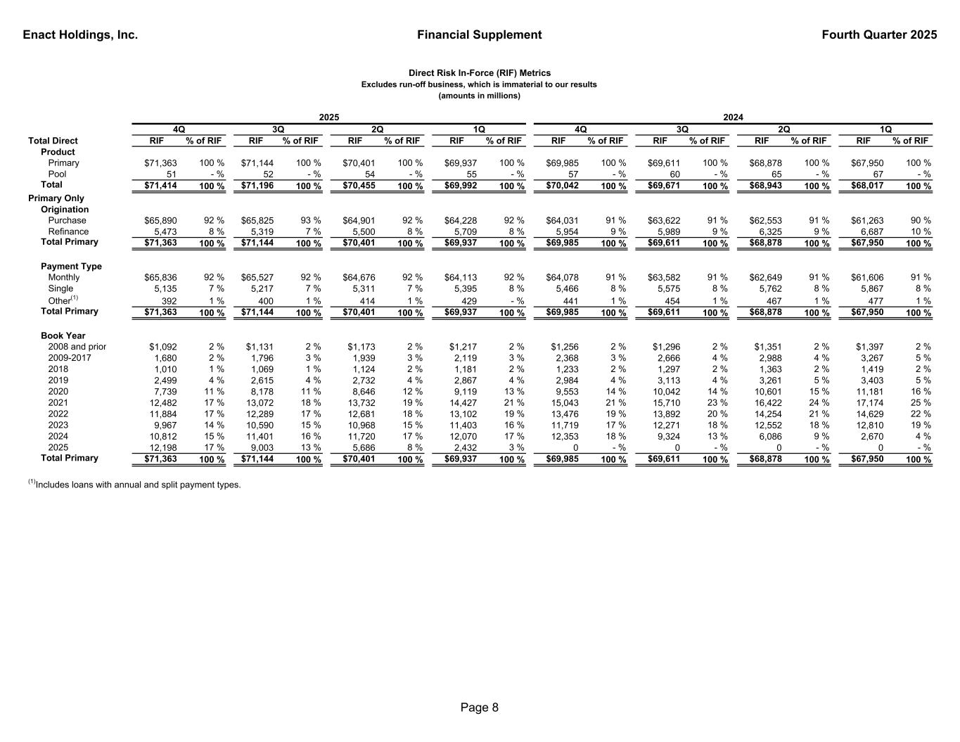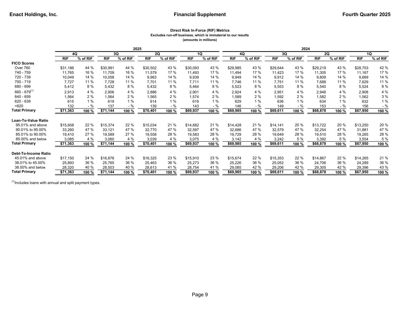 Enact Holdings, Inc. Financial Supplement Fourth Quarter 2025 Total Direct RIF % of RIF RIF % of RIF RIF % of RIF RIF % of RIF RIF % of RIF RIF % of RIF RIF % of RIF RIF % of RIF Product Primary $71,363 100 % $71,144 100 % $70,401 100 % $69,937 100 % $69,985 100 % $69,611 100 % $68,878 100 % $67,950 100 % Pool 51 - % 52 - % 54 - % 55 - % 57 - % 60 - % 65 - % 67 - % Total $71,414 100 % $71,196 100 % $70,455 100 % $69,992 100 % $70,042 100 % $69,671 100 % $68,943 100 % $68,017 100 % Primary Only Origination Purchase $65,890 92 % $65,825 93 % $64,901 92 % $64,228 92 % $64,031 91 % $63,622 91 % $62,553 91 % $61,263 90 % Refinance 5,473 8 % 5,319 7 % 5,500 8 % 5,709 8 % 5,954 9 % 5,989 9 % 6,325 9 % 6,687 10 % Total Primary $71,363 100 % $71,144 100 % $70,401 100 % $69,937 100 % $69,985 100 % $69,611 100 % $68,878 100 % $67,950 100 % Payment Type Monthly $65,836 92 % $65,527 92 % $64,676 92 % $64,113 92 % $64,078 91 % $63,582 91 % $62,649 91 % $61,606 91 % Single 5,135 7 % 5,217 7 % 5,311 7 % 5,395 8 % 5,466 8 % 5,575 8 % 5,762 8 % 5,867 8 % Other(1) 392 1 % 400 1 % 414 1 % 429 - % 441 1 % 454 1 % 467 1 % 477 1 % Total Primary $71,363 100 % $71,144 100 % $70,401 100 % $69,937 100 % $69,985 100 % $69,611 100 % $68,878 100 % $67,950 100 % Book Year 2008 and prior $1,092 2 % $1,131 2 % $1,173 2 % $1,217 2 % $1,256 2 % $1,296 2 % $1,351 2 % $1,397 2 % 2009-2017 1,680 2 % 1,796 3 % 1,939 3 % 2,119 3 % 2,368 3 % 2,666 4 % 2,988 4 % 3,267 5 % 2018 1,010 1 % 1,069 1 % 1,124 2 % 1,181 2 % 1,233 2 % 1,297 2 % 1,363 2 % 1,419 2 % 2019 2,499 4 % 2,615 4 % 2,732 4 % 2,867 4 % 2,984 4 % 3,113 4 % 3,261 5 % 3,403 5 % 2020 7,739 11 % 8,178 11 % 8,646 12 % 9,119 13 % 9,553 14 % 10,042 14 % 10,601 15 % 11,181 16 % 2021 12,482 17 % 13,072 18 % 13,732 19 % 14,427 21 % 15,043 21 % 15,710 23 % 16,422 24 % 17,174 25 % 2022 11,884 17 % 12,289 17 % 12,681 18 % 13,102 19 % 13,476 19 % 13,892 20 % 14,254 21 % 14,629 22 % 2023 9,967 14 % 10,590 15 % 10,968 15 % 11,403 16 % 11,719 17 % 12,271 18 % 12,552 18 % 12,810 19 % 2024 10,812 15 % 11,401 16 % 11,720 17 % 12,070 17 % 12,353 18 % 9,324 13 % 6,086 9 % 2,670 4 % 2025 12,198 17 % 9,003 13 % 5,686 8 % 2,432 3 % 0 - % 0 - % 0 - % 0 - % Total Primary $71,363 100 % $71,144 100 % $70,401 100 % $69,937 100 % $69,985 100 % $69,611 100 % $68,878 100 % $67,950 100 % (1)Includes loans with annual and split payment types. Direct Risk In-Force (RIF) Metrics Excludes run-off business, which is immaterial to our results (amounts in millions) 1Q2Q4Q 3Q 2024 1Q4Q 2025 2Q3Q Page 8