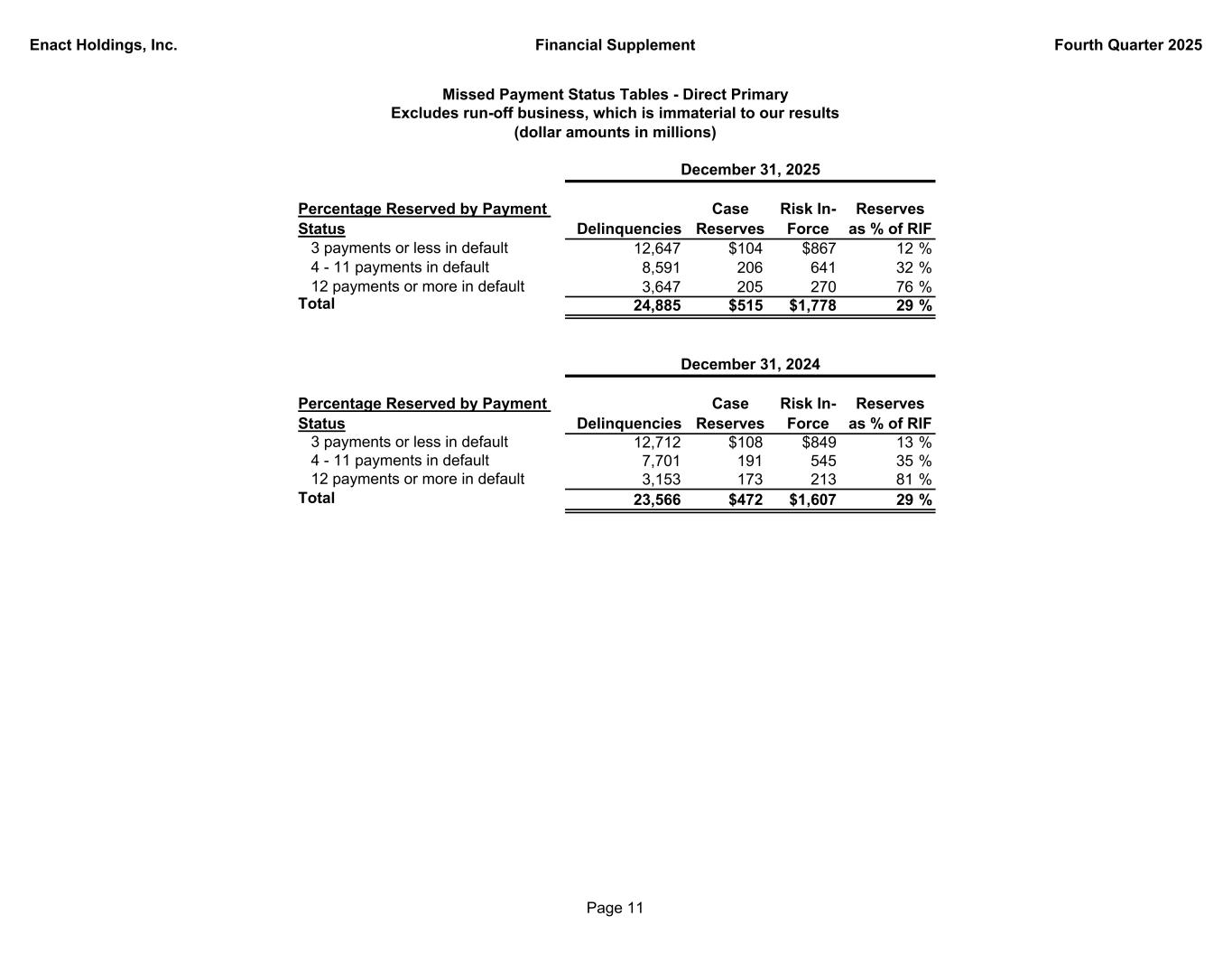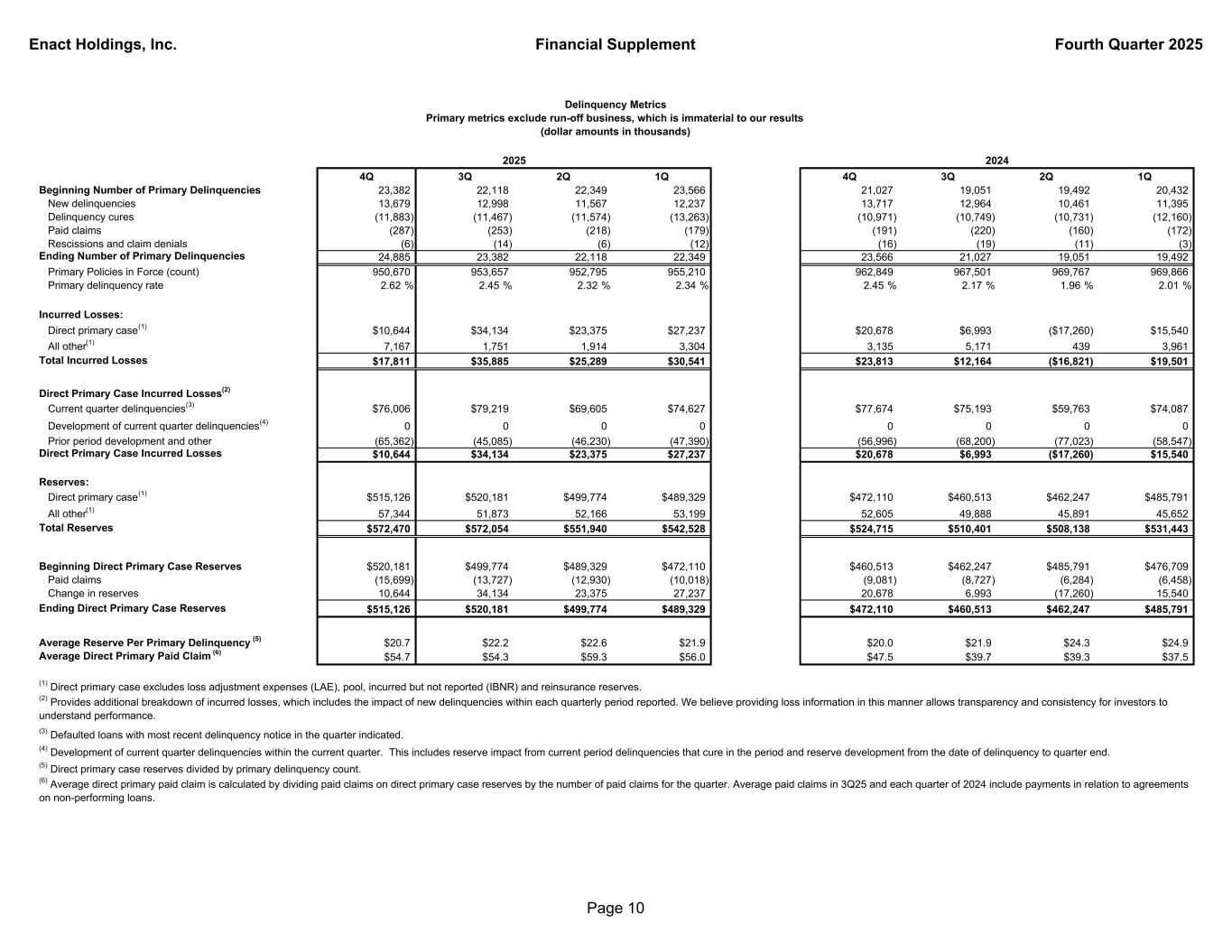 Enact Holdings, Inc. Financial Supplement Fourth Quarter 2025 4Q 3Q 2Q 1Q 4Q 3Q 2Q 1Q Beginning Number of Primary Delinquencies 23,382 22,118 22,349 23,566 21,027 19,051 19,492 20,432 New delinquencies 13,679 12,998 11,567 12,237 13,717 12,964 10,461 11,395 Delinquency cures (11,883) (11,467) (11,574) (13,263) (10,971) (10,749) (10,731) (12,160) Paid claims (287) (253) (218) (179) (191) (220) (160) (172) Rescissions and claim denials (6) (14) (6) (12) (16) (19) (11) (3) Ending Number of Primary Delinquencies 24,885 23,382 22,118 22,349 23,566 21,027 19,051 19,492 Primary Policies in Force (count) 950,670 953,657 952,795 955,210 962,849 967,501 969,767 969,866 Primary delinquency rate 2.62 % 2.45 % 2.32 % 2.34 % 2.45 % 2.17 % 1.96 % 2.01 % Incurred Losses: Direct primary case(1) $10,644 $34,134 $23,375 $27,237 $20,678 $6,993 ($17,260) $15,540 All other(1) 7,167 1,751 1,914 3,304 3,135 5,171 439 3,961 Total Incurred Losses $17,811 $35,885 $25,289 $30,541 $23,813 $12,164 ($16,821) $19,501 Direct Primary Case Incurred Losses(2) Current quarter delinquencies(3) $76,006 $79,219 $69,605 $74,627 $77,674 $75,193 $59,763 $74,087 Development of current quarter delinquencies(4) 0 0 0 0 0 0 0 0 Prior period development and other (65,362) (45,085) (46,230) (47,390) (56,996) (68,200) (77,023) (58,547) Direct Primary Case Incurred Losses $10,644 $34,134 $23,375 $27,237 $20,678 $6,993 ($17,260) $15,540 Reserves: Direct primary case(1) $515,126 $520,181 $499,774 $489,329 $472,110 $460,513 $462,247 $485,791 All other(1) 57,344 51,873 52,166 53,199 52,605 49,888 45,891 45,652 Total Reserves $572,470 $572,054 $551,940 $542,528 $524,715 $510,401 $508,138 $531,443 Beginning Direct Primary Case Reserves $520,181 $499,774 $489,329 $472,110 $460,513 $462,247 $485,791 $476,709 Paid claims (15,699) (13,727) (12,930) (10,018) (9,081) (8,727) (6,284) (6,458) Change in reserves 10,644 34,134 23,375 27,237 20,678 6,993 (17,260) 15,540 Ending Direct Primary Case Reserves $515,126 $520,181 $499,774 $489,329 $472,110 $460,513 $462,247 $485,791 Average Reserve Per Primary Delinquency (5) $20.7 $22.2 $22.6 $21.9 $20.0 $21.9 $24.3 $24.9 Average Direct Primary Paid Claim (6) $54.7 $54.3 $59.3 $56.0 $47.5 $39.7 $39.3 $37.5 Delinquency Metrics Primary metrics exclude run-off business, which is immaterial to our results (dollar amounts in thousands) 2024 (5) Direct primary case reserves divided by primary delinquency count. 2025 (6) Average direct primary paid claim is calculated by dividing paid claims on direct primary case reserves by the number of paid claims for the quarter. Average paid claims in 3Q25 and each quarter of 2024 include payments in relation to agreements on non-performing loans. (2) Provides additional breakdown of incurred losses, which includes the impact of new delinquencies within each quarterly period reported. We believe providing loss information in this manner allows transparency and consistency for investors to understand performance. (3) Defaulted loans with most recent delinquency notice in the quarter indicated. (1) Direct primary case excludes loss adjustment expenses (LAE), pool, incurred but not reported (IBNR) and reinsurance reserves. (4) Development of current quarter delinquencies within the current quarter. This includes reserve impact from current period delinquencies that cure in the period and reserve development from the date of delinquency to quarter end. Page 10