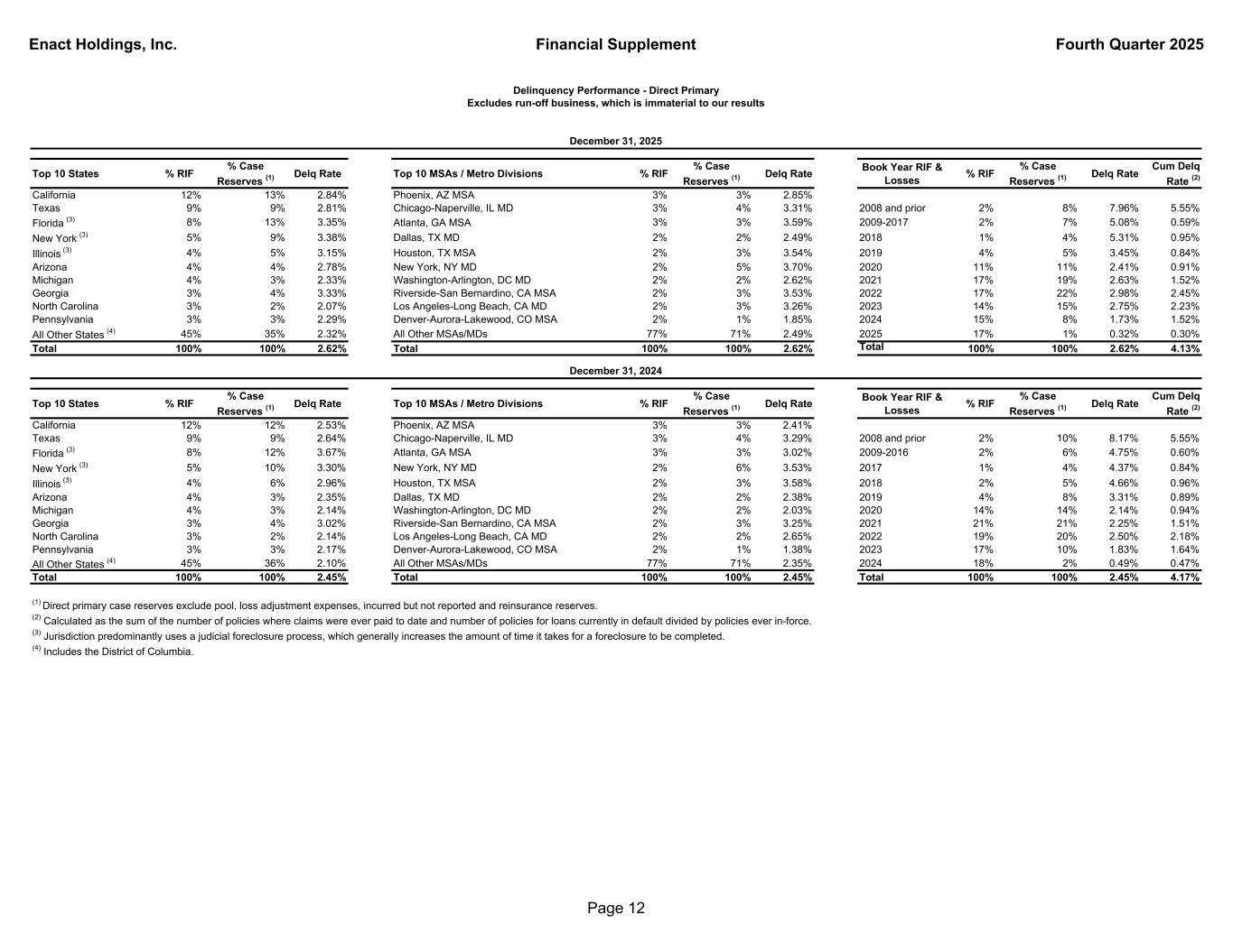 Enact Holdings, Inc. Financial Supplement Fourth Quarter 2025 Percentage Reserved by Payment Status Delinquencies Case Reserves Risk In- Force Reserves as % of RIF 3 payments or less in default 12,647 $104 $867 12 % 4 - 11 payments in default 8,591 206 641 32 % 12 payments or more in default 3,647 205 270 76 % Total 24,885 $515 $1,778 29 % Percentage Reserved by Payment Status Delinquencies Case Reserves Risk In- Force Reserves as % of RIF 3 payments or less in default 12,712 $108 $849 13 % 4 - 11 payments in default 7,701 191 545 35 % 12 payments or more in default 3,153 173 213 81 % Total 23,566 $472 $1,607 29 % December 31, 2024 Missed Payment Status Tables - Direct Primary Excludes run-off business, which is immaterial to our results (dollar amounts in millions) December 31, 2025 Page 11