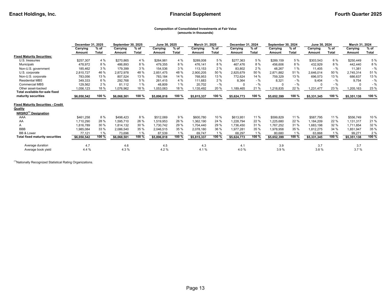 Enact Holdings, Inc. Financial Supplement Fourth Quarter 2025 Carrying Amount % of Total Carrying Amount % of Total Carrying Amount % of Total Carrying Amount % of Total Carrying Amount % of Total Carrying Amount % of Total Carrying Amount % of Total Carrying Amount % of Total Fixed Maturity Securities: U.S. treasuries $257,307 4 % $270,865 4 % $264,981 4 % $289,008 5 % $277,363 5 % $289,159 5 % $303,543 6 % $250,449 5 % Municipals 478,972 8 % 486,893 8 % 479,355 8 % 476,141 8 % 467,476 8 % 456,606 8 % 432,929 8 % 442,440 8 % Non-U.S. government 185,462 3 % 179,399 3 % 154,536 3 % 113,153 2 % 83,802 2 % 48,267 1 % 11,405 - % 11,381 - % U.S. corporate 2,810,727 46 % 2,872,978 48 % 2,851,475 48 % 2,900,205 50 % 2,825,679 50 % 2,871,882 51 % 2,646,014 50 % 2,745,314 51 % Non-U.S. corporate 783,056 13 % 807,524 13 % 783,184 14 % 768,953 13 % 772,624 14 % 759,329 13 % 696,573 13 % 686,637 13 % Residential MBS 349,333 6 % 292,768 5 % 261,415 4 % 111,683 2 % 8,364 - % 8,321 - % 9,404 - % 9,754 - % Commercial MBS 129,562 2 % 81,112 1 % 48,809 1 % 20,702 - % 0 - % 0 - % 0 - % 0 - % Other asset-backed 1,056,123 18 % 1,076,962 18 % 1,053,063 18 % 1,135,492 20 % 1,189,465 21 % 1,218,835 22 % 1,231,477 23 % 1,205,163 23 % Total available-for-sale fixed maturity securities $6,050,542 100 % $6,068,501 100 % $5,896,818 100 % $5,815,337 100 % $5,624,773 100 % $5,652,399 100 % $5,331,345 100 % $5,351,138 100 % Fixed Maturity Securities - Credit Quality NRSRO(1) Designation AAA $461,258 8 % $498,423 8 % $512,069 9 % $600,780 10 % $613,951 11 % $599,829 11 % $587,795 11 % $556,749 10 % AA 1,710,290 28 % 1,595,710 26 % 1,519,953 26 % 1,362,190 24 % 1,228,794 22 % 1,225,680 22 % 1,184,209 22 % 1,131,317 21 % A 1,816,789 30 % 1,814,132 30 % 1,730,742 29 % 1,704,440 29 % 1,736,450 31 % 1,767,252 31 % 1,683,198 32 % 1,711,854 32 % BBB 1,985,084 33 % 2,086,540 35 % 2,046,515 35 % 2,078,180 36 % 1,977,281 35 % 1,978,958 35 % 1,812,275 34 % 1,851,947 35 % BB & Lower 77,121 1 % 73,696 1 % 87,539 1 % 69,747 1 % 68,297 1 % 80,680 1 % 63,868 1 % 99,271 2 % Total fixed maturity securities $6,050,542 100 % $6,068,501 100 % $5,896,818 100 % $5,815,337 100 % $5,624,773 100 % $5,652,399 100 % $5,331,345 100 % $5,351,138 100 % Average duration 4.7 4.6 4.5 4.3 4.1 3.9 3.7 3.7 Average book yield 4.4 % 4.3 % 4.2 % 4.1 % 4.0 % 3.9 % 3.8 % 3.7 % (1)Nationally Recognized Statistical Rating Organizations. December 31, 2024 September 30, 2024 Composition of Consolidated Investments at Fair Value (amounts in thousands) March 31, 2024June 30, 2024March 31, 2025December 31, 2025 June 30, 2025September 30, 2025 Page 13