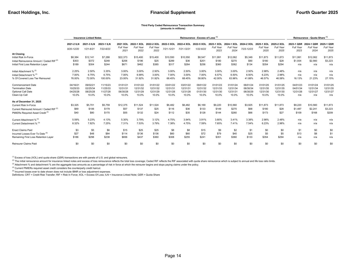 Enact Holdings, Inc. Financial Supplement Fourth Quarter 2025 2021-2 ILN 2021-3 ILN 2023-1 ILN 2021 XOL 2022-1 XOL 2022-2 XOL 2022-3 XOL 2022-4 XOL 2022-5 XOL 2023-1 XOL 2024-1 XOL 2024-2 XOL 2025-1 XOL 2025-2 XOL 2023-1 QSR 2024-1 QSR 2025-1 QSR 9/20-12/20 1/21-6/21 7/22-6/23 Full Year 2021 Full Year 2022 Full Year 2022 7/21-12/21 7/21-12/21 1/22-6/22 Full Year 2023 Full Year 2024 7/23-12/23 Full Year 2025 Full Year 2025 Full Year 2023 Full Year 2024 Full Year 2025 At Closing Initial Risk In-Force $8,384 $12,141 $7,288 $22,373 $15,400 $15,400 $10,550 $10,550 $8,547 $11,991 $12,062 $5,349 $11,873 $11,873 $11,991 $12,062 $11,873 Initial Reinsurance Amount / Ceded RIF (2) $303 $372 $248 $206 $196 $25 $289 $36 $201 $180 $270 $90 $180 $28 $1,934 $2,560 $3,223 Initial First Loss Retention Layer $189 $304 $244 $671 $462 $385 $317 $264 $256 $360 $362 $134 $354 $294 n/a n/a n/a Initial Attachment % (3) 2.25% 2.50% 3.35% 3.00% 3.00% 2.50% 3.00% 2.50% 3.00% 3.00% 3.00% 2.50% 2.98% 2.48% n/a n/a n/a Initial Detachment % (3) 7.00% 6.75% 6.75% 7.00% 6.99% 3.00% 7.00% 3.00% 7.00% 6.57% 6.50% 6.50% 6.23% 2.98% n/a n/a n/a % Of Covered Loss Tier Reinsured 76.00% 72.00% 100.00% 23.00% 31.92% 31.92% 68.45% 68.45% 58.80% 42.00% 63.96% 41.88% 46.57% 46.58% 16.13% 21.23% 27.15% Commencement Date 04/16/21 09/02/21 11/15/23 01/01/21 01/01/22 01/01/22 03/01/22 03/01/22 09/01/22 01/01/23 01/01/24 06/01/24 01/01/25 01/01/25 04/01/23 01/01/24 01/01/25 Termination Date 10/25/33 02/25/34 11/25/33 12/31/31 12/31/32 12/31/32 12/31/31 12/31/31 12/31/32 12/31/33 12/31/34 06/30/34 12/31/35 12/31/35 04/01/34 12/31/34 12/31/35 Optional Call Date 04/25/28 08/25/28 11/27/28 06/30/28 12/31/29 12/31/29 12/31/28 12/31/28 01/01/30 12/31/30 12/31/31 06/30/29 12/31/30 12/31/30 12/31/26 12/31/27 12/31/27 Clean-Up Call 10.0% 10.0% 10.0% 10.0% 10.0% 10.0% 10.0% 10.0% 10.0% 10.0% 10.0% 10.0% 10.0% 10.0% n/a n/a n/a As of December 31, 2025 Current Risk In-Force $3,325 $5,701 $5,759 $12,375 $11,524 $11,524 $6,482 $6,482 $6,169 $9,220 $10,560 $3,925 $11,873 $11,873 $9,220 $10,560 $11,873 Current Reinsured Amount / Ceded RIF (2) $69 $106 $179 $57 $137 $25 $116 $36 $133 $149 $270 $68 $180 $28 $1,487 $2,241 $3,223 PMIERs Required Asset Credit (4) $40 $80 $170 $55 $132 $24 $112 $35 $128 $144 $260 $66 $173 $27 $109 $168 $209 Current Attachment % (3) 5.59% 5.23% 4.13% 5.30% 3.79% 3.12% 4.75% 3.94% 3.91% 3.80% 3.41% 3.38% 2.98% 2.48% n/a n/a n/a Current Detachment % (3) 8.32% 7.82% 7.25% 7.31% 7.53% 3.79% 7.38% 4.75% 7.59% 7.65% 7.41% 7.54% 6.23% 2.98% n/a n/a n/a Enact Claims Paid $3 $5 $6 $15 $25 $25 $8 $8 $15 $9 $2 $1 $0 $0 $1 $0 $0 Incurred Losses Ever To Date (5) $27 $48 $84 $114 $136 $136 $60 $60 $72 $79 $40 $25 $5 $5 $13 $8 $1 Remaining First Loss Retention Layer $186 $298 $238 $656 $437 $360 $308 $255 $241 $351 $360 $133 $354 $294 n/a n/a n/a Reinsurer Claims Paid $0 $0 $0 $0 $0 $0 $0 $0 $0 $0 $0 $0 $0 $0 $0 $0 $0 Third Party Ceded Reinsurance Transaction Summary (amounts in millions) (1) Excess of loss (XOL) and quota share (QSR) transactions are with panels of U.S. and global reinsurers. (2) The initial reinsurance amount for insurance linked notes and excess of loss reinsurance reflects the total loss coverage; Ceded RIF reflects the RIF associated with quota share reinsurance which is subject to annual and life loss ratio limits. (3) Attachment % and detachment % are the aggregate loss amounts as a percentage of risk in force at which the reinsurer begins and stops paying claims under the policy. (4) Current PMIERs required asset credit considers the counterparty credit haircut. (5) Incurred losses ever to date shown does not include IBNR or loss adjustment expenses. Definitions: CRT = Credit Risk Transfer; RIF = Risk In Force; XOL = Excess Of Loss; ILN = Insurance Linked Note; QSR = Quota Share Reinsurance - Excess of Loss (1) Reinsurance - Quota Share (1)Insurance Linked Notes Page 14
