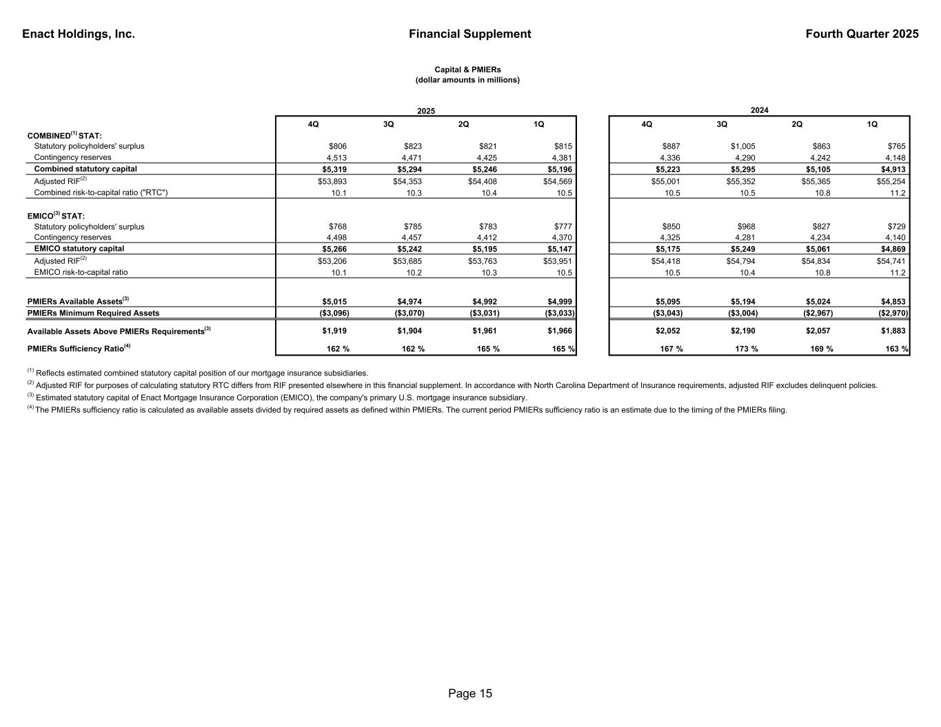 Enact Holdings, Inc. Financial Supplement Fourth Quarter 2025 4Q 3Q 2Q 1Q 4Q 3Q 2Q 1Q COMBINED(1) STAT: Statutory policyholders' surplus $806 $823 $821 $815 $887 $1,005 $863 $765 Contingency reserves 4,513 4,471 4,425 4,381 4,336 4,290 4,242 4,148 Combined statutory capital $5,319 $5,294 $5,246 $5,196 $5,223 $5,295 $5,105 $4,913 Adjusted RIF(2) $53,893 $54,353 $54,408 $54,569 $55,001 $55,352 $55,365 $55,254 Combined risk-to-capital ratio ("RTC") 10.1 10.3 10.4 10.5 10.5 10.5 10.8 11.2 EMICO(3) STAT: Statutory policyholders' surplus $768 $785 $783 $777 $850 $968 $827 $729 Contingency reserves 4,498 4,457 4,412 4,370 4,325 4,281 4,234 4,140 EMICO statutory capital $5,266 $5,242 $5,195 $5,147 $5,175 $5,249 $5,061 $4,869 Adjusted RIF(2) $53,206 $53,685 $53,763 $53,951 $54,418 $54,794 $54,834 $54,741 EMICO risk-to-capital ratio 10.1 10.2 10.3 10.5 10.5 10.4 10.8 11.2 PMIERs Available Assets(3) $5,015 $4,974 $4,992 $4,999 $5,095 $5,194 $5,024 $4,853 PMIERs Minimum Required Assets ($3,096) ($3,070) ($3,031) ($3,033) ($3,043) ($3,004) ($2,967) ($2,970) Available Assets Above PMIERs Requirements(3) $1,919 $1,904 $1,961 $1,966 $2,052 $2,190 $2,057 $1,883 PMIERs Sufficiency Ratio(4) 162 % 162 % 165 % 165 % 167 % 173 % 169 % 163 % (4) The PMIERs sufficiency ratio is calculated as available assets divided by required assets as defined within PMIERs. The current period PMIERs sufficiency ratio is an estimate due to the timing of the PMIERs filing. 2024 Capital & PMIERs (dollar amounts in millions) (3) Estimated statutory capital of Enact Mortgage Insurance Corporation (EMICO), the company's primary U.S. mortgage insurance subsidiary. (1) Reflects estimated combined statutory capital position of our mortgage insurance subsidiaries. (2) Adjusted RIF for purposes of calculating statutory RTC differs from RIF presented elsewhere in this financial supplement. In accordance with North Carolina Department of Insurance requirements, adjusted RIF excludes delinquent policies. 2025 Page 15
